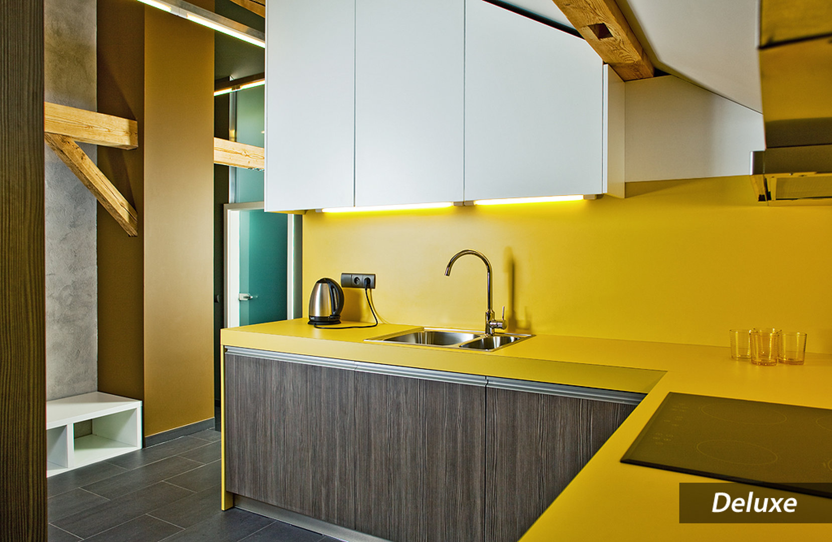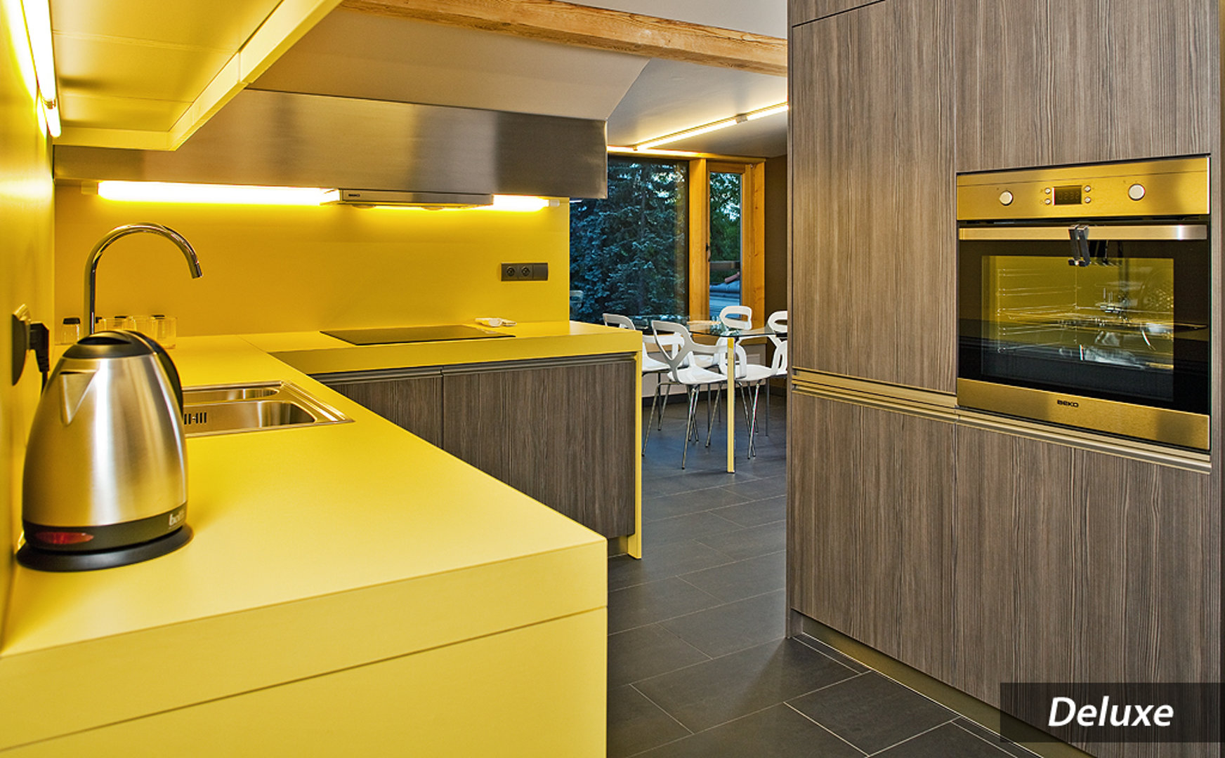 Utrzymany w odcieniach żółci aneks kuchenny wyposażono w nowoczesne udogodnienia, takie jak kuchenka, zmywarka do naczyń i lodówka. Goście mogą ponadto korzystać z jadalni ze stołem.
